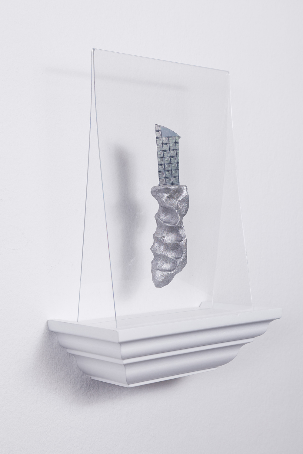 broken silicon wafers, epoxy clay, nail polish, acrylic case, wooden shelf